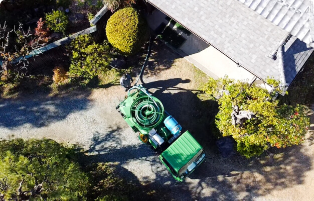 バキュームカーを用いて、汲み取り式トイレのし尿汲み取りを行っています。(自治体からの委託業務)