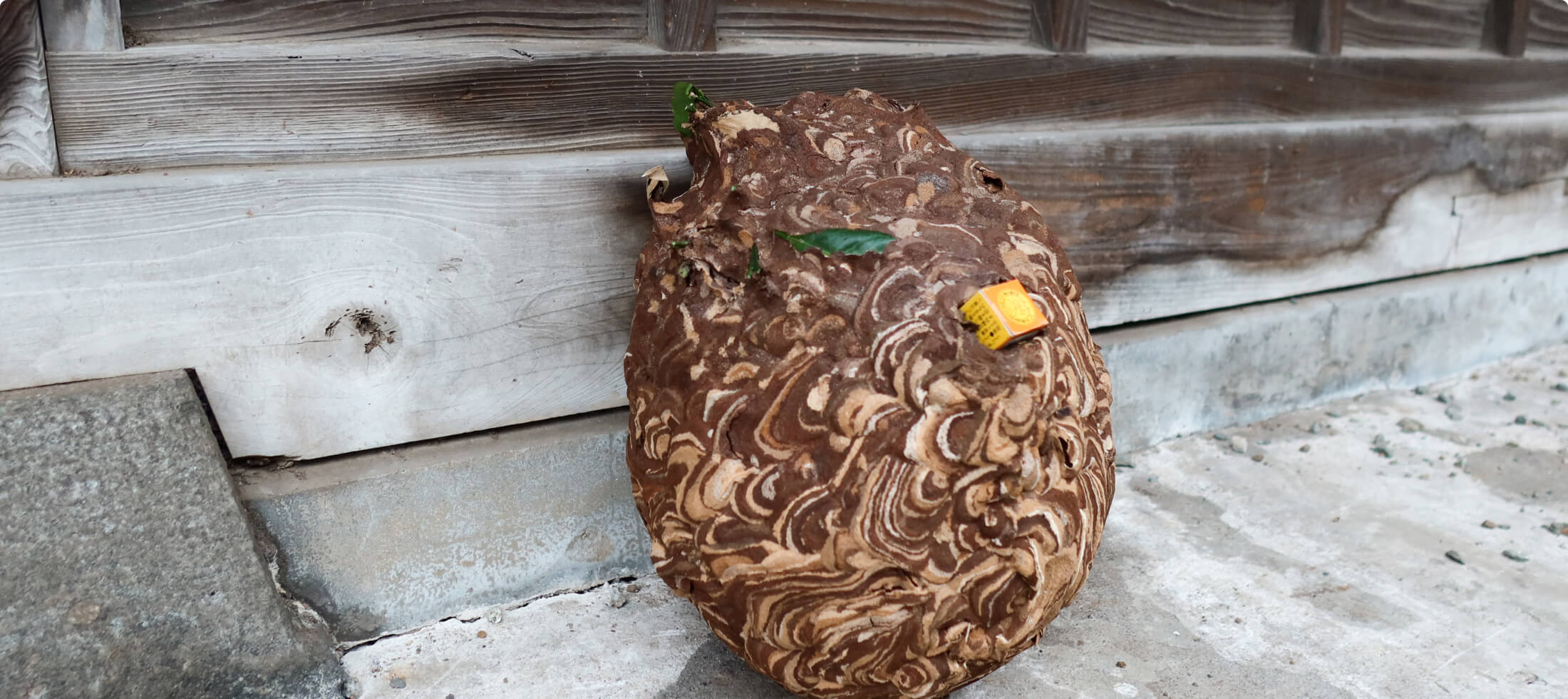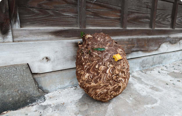 ハチの巣を発見したら、直ちに当社までご連絡ください。ハチの巣ハンターが駆除用の防護服を着用の上、巣全体に対して薬剤を噴霧し、完全に駆除します。ヘビやネズミ他害虫にも対応しています。