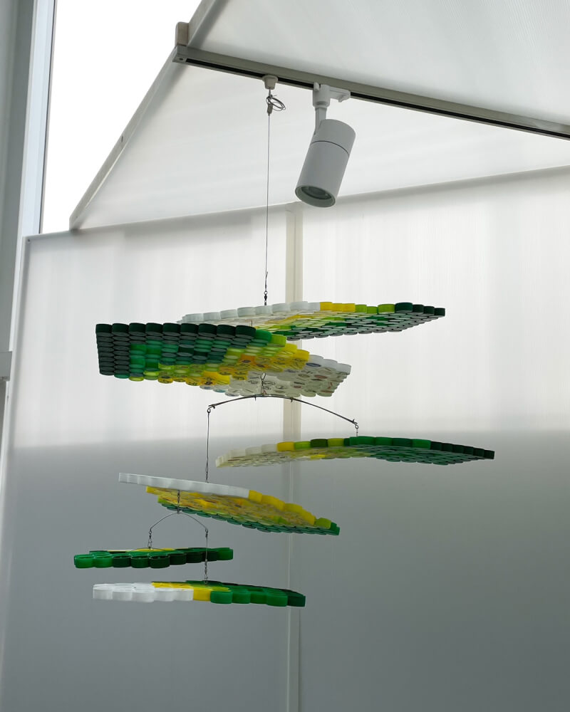 「木漏れ日のモビール」(橘田耕治氏、ペットボトルキャップを使用)