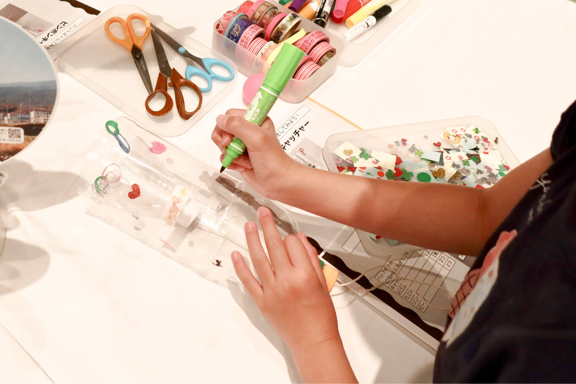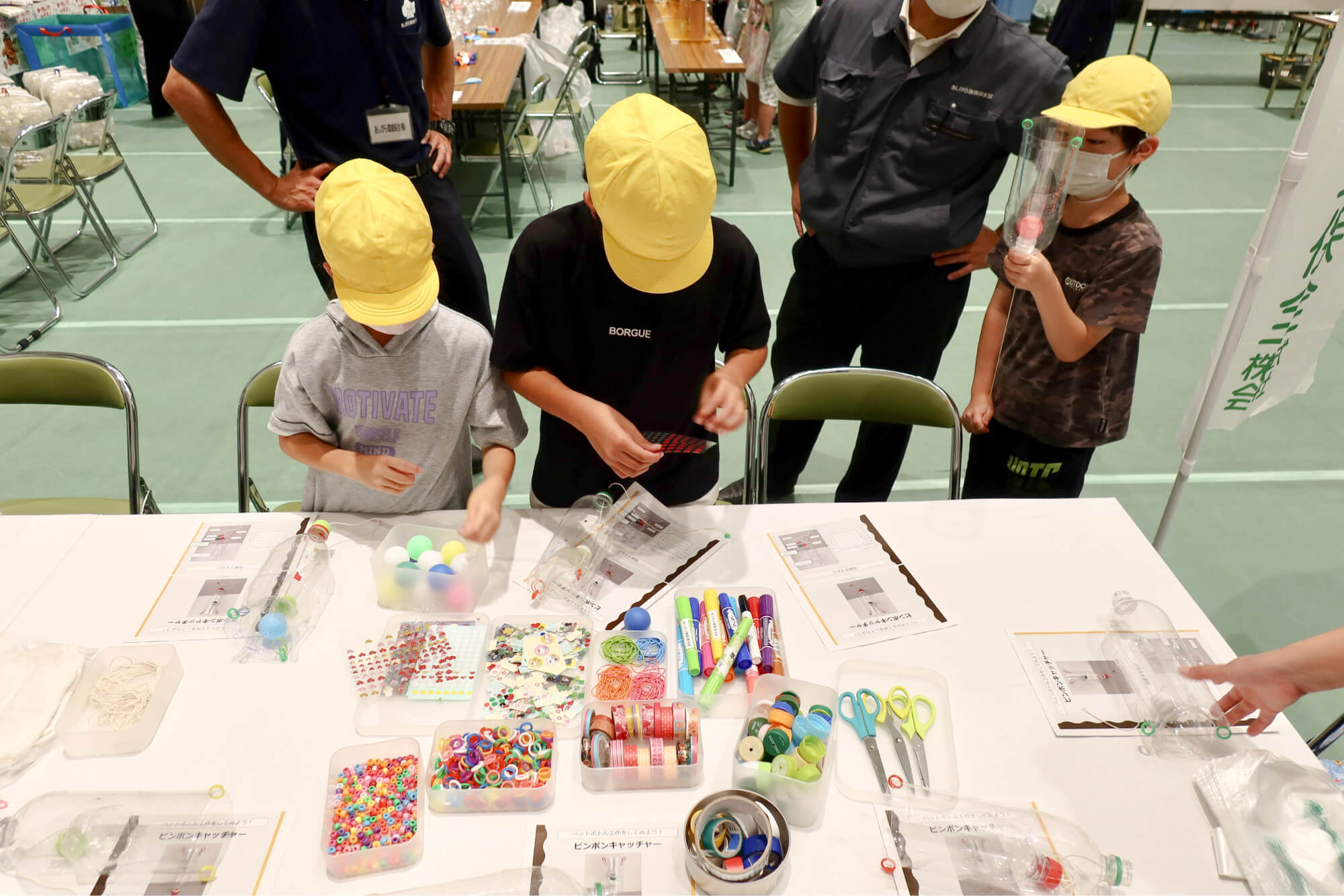 ペットボトルを再利用する形で簡単な玩具を工作する、子供たちに大好評のブースです。