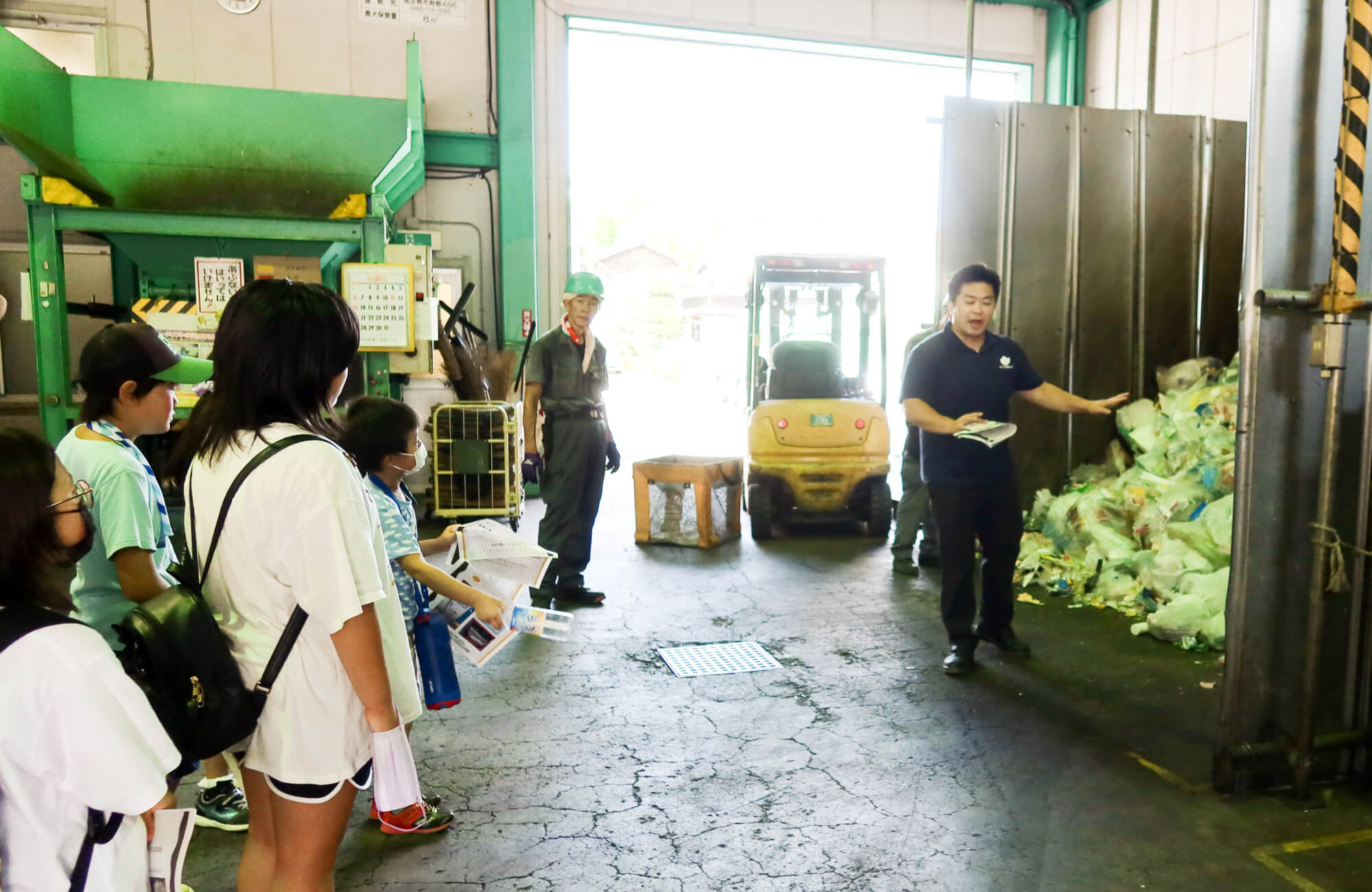 内容は、当社工場におけるペットボトル・容器包装プラスチックの中間処理工程(収集→トラックからの荷下ろし→仕分け→圧縮→梱包)を見学し、「なぜ分別をする必要があるのか」、「ペットボトルの正しい分別方法」を学ぶものでした。