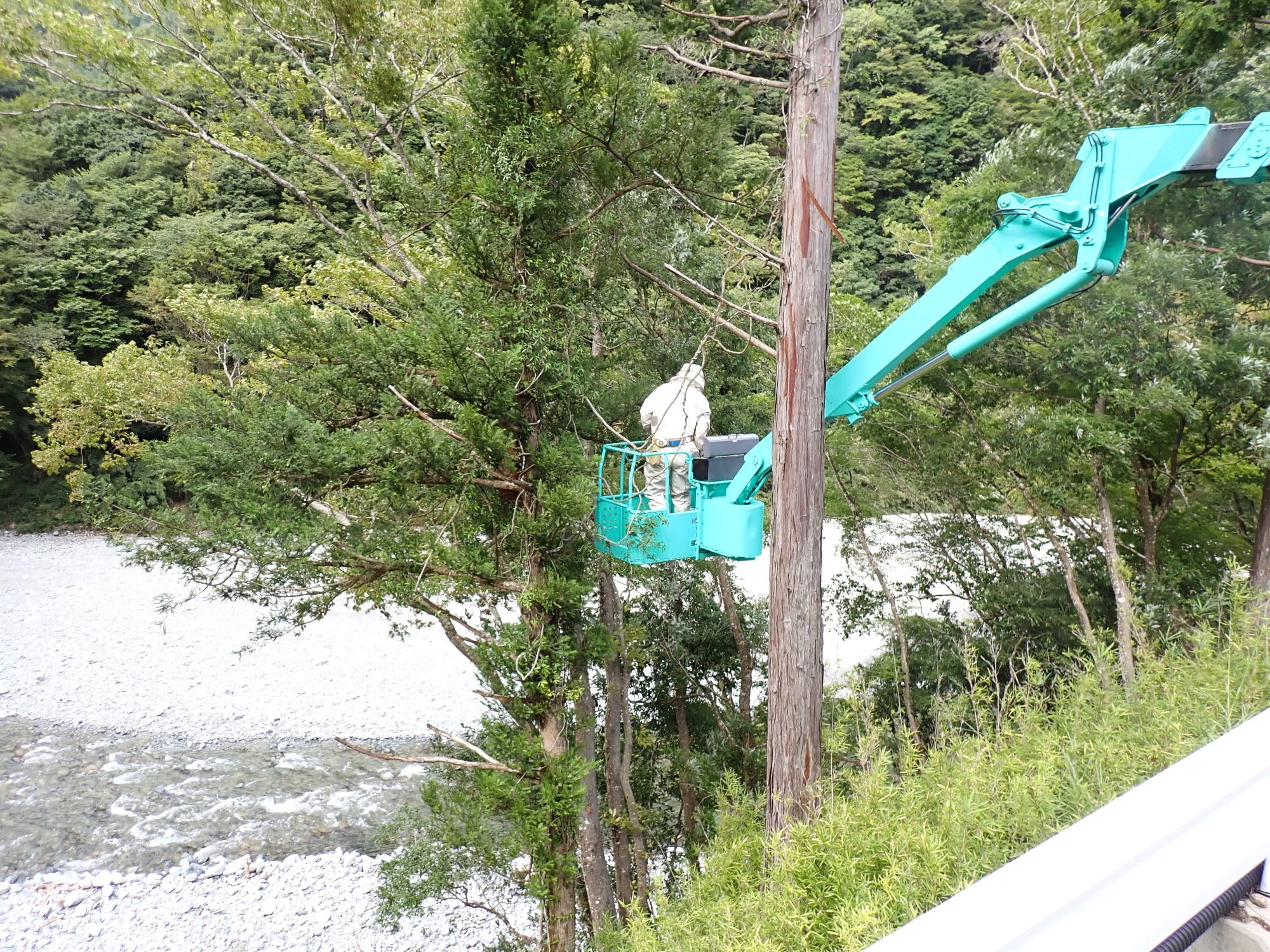 2階部分や橋の下など、人の手が届かない場所では作業車を使い、近づいてから駆除します。