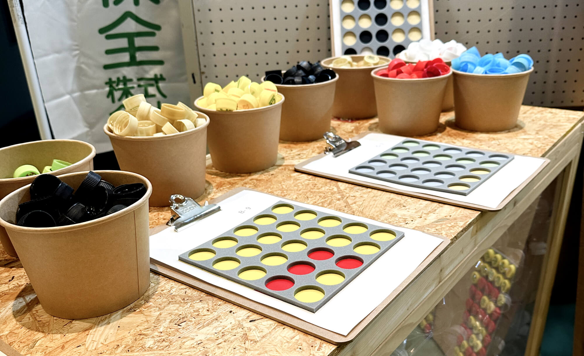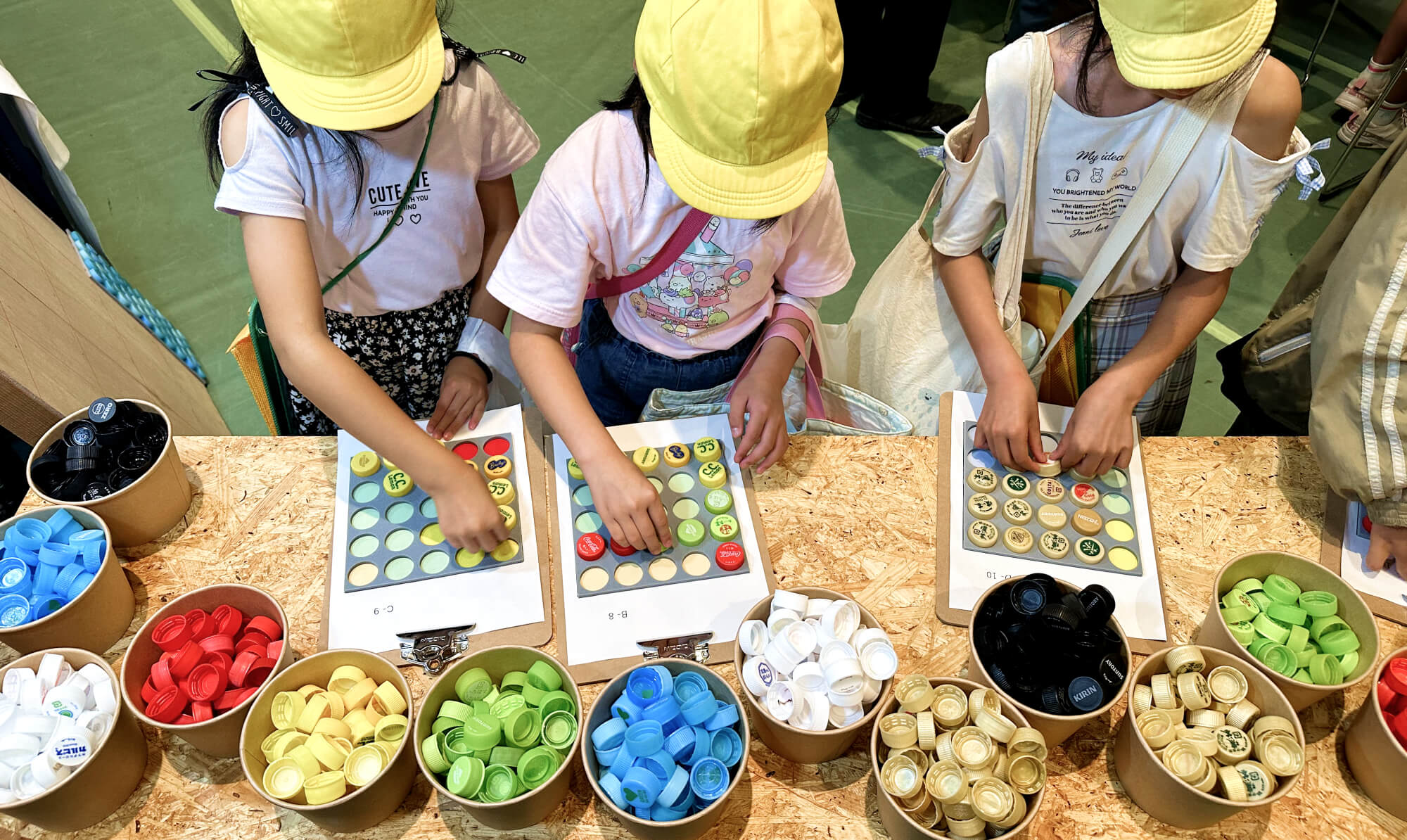 ウレタンの台紙にペットボトルキャップをはめて絵を完成させるというもので、ブースを通りがかった小学生を中心に幅広い年代の方に参加していただきました。