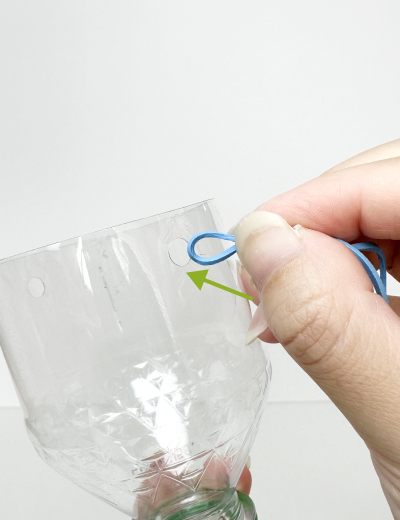 ペットボトル小の、もう一方のあなに、わゴムを通します。