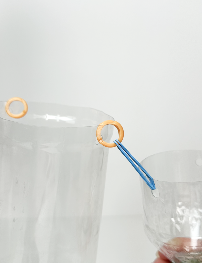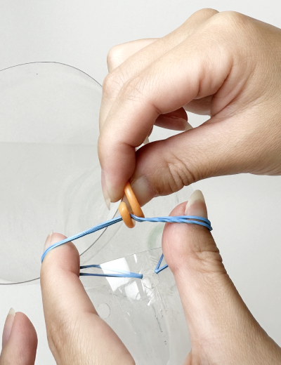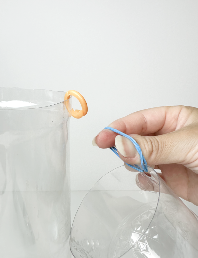 ペットボトル大の外がわから、わゴムをリングにさしこんでいきましょう。