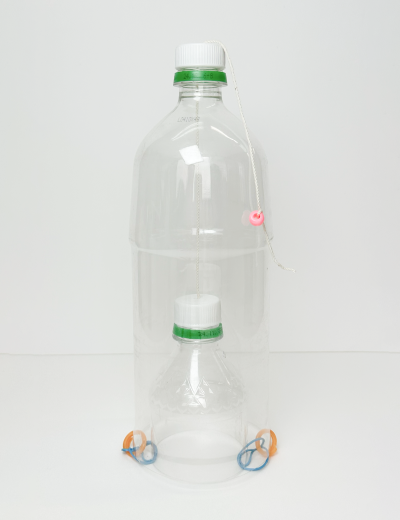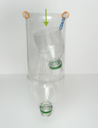 今度は反対がわです。まず、ペットボトル小をペットボトル大の中に入れましょう。注意:たこ糸もペットボトル大の中に入れる!