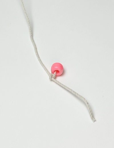 たこ糸をビーズに通したら、かたむすびをしてください。ほどけなければ、どんなむすび方でもよいです。